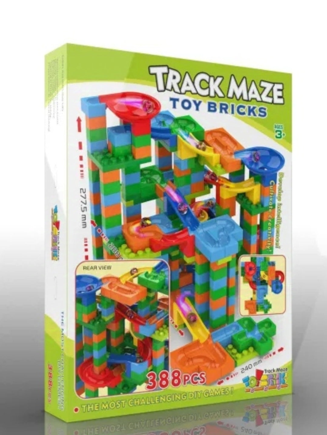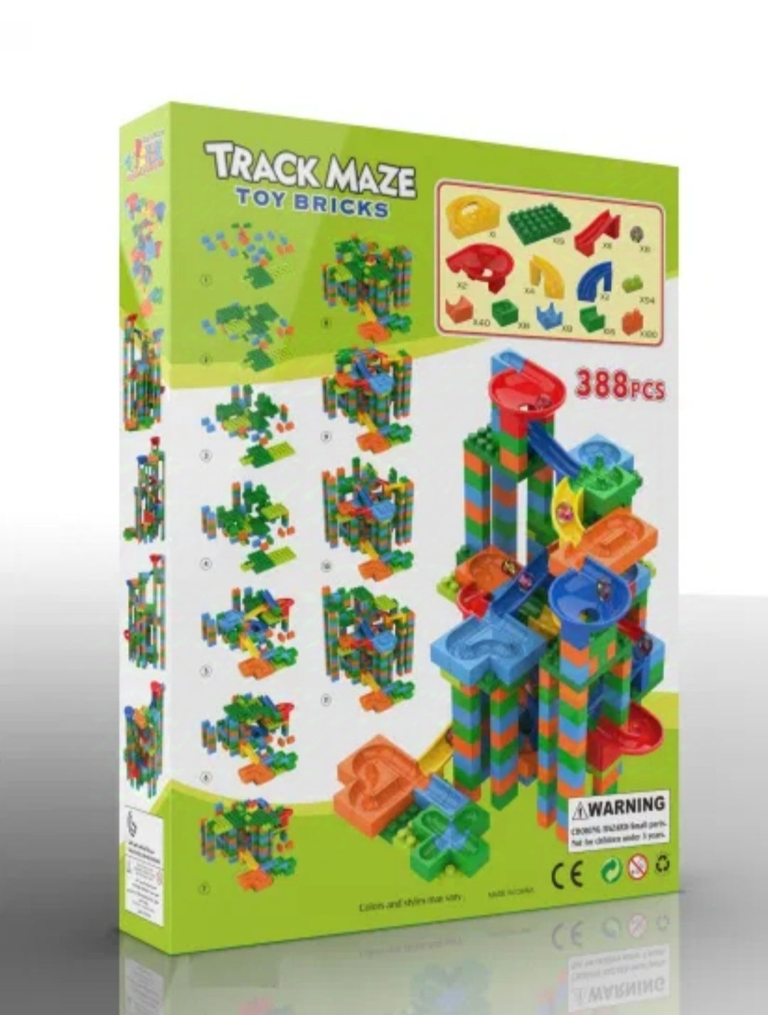Set se sastoji iz 388 delova: kockice, delovi za pravljenje tobogana, klikeri.